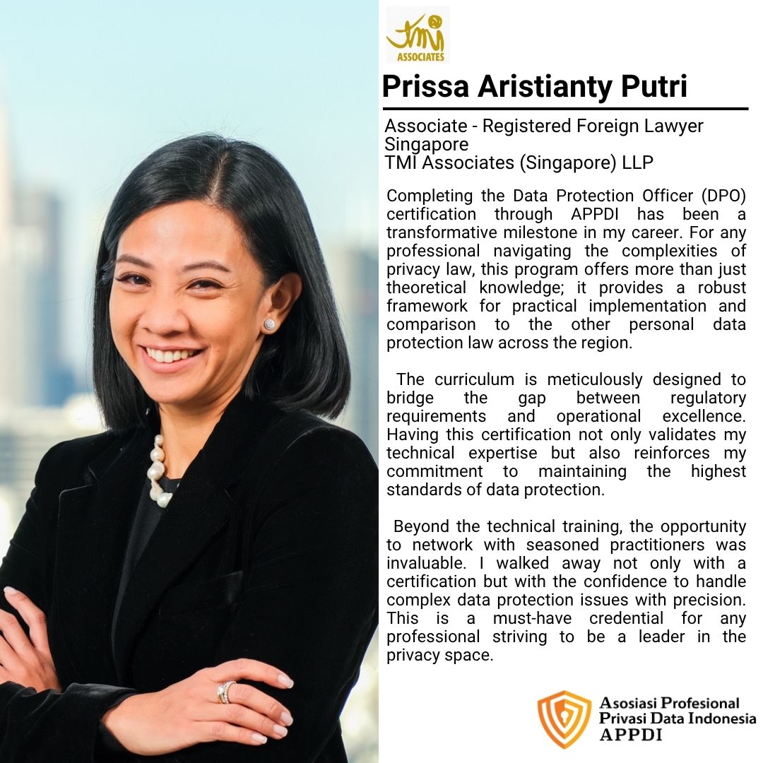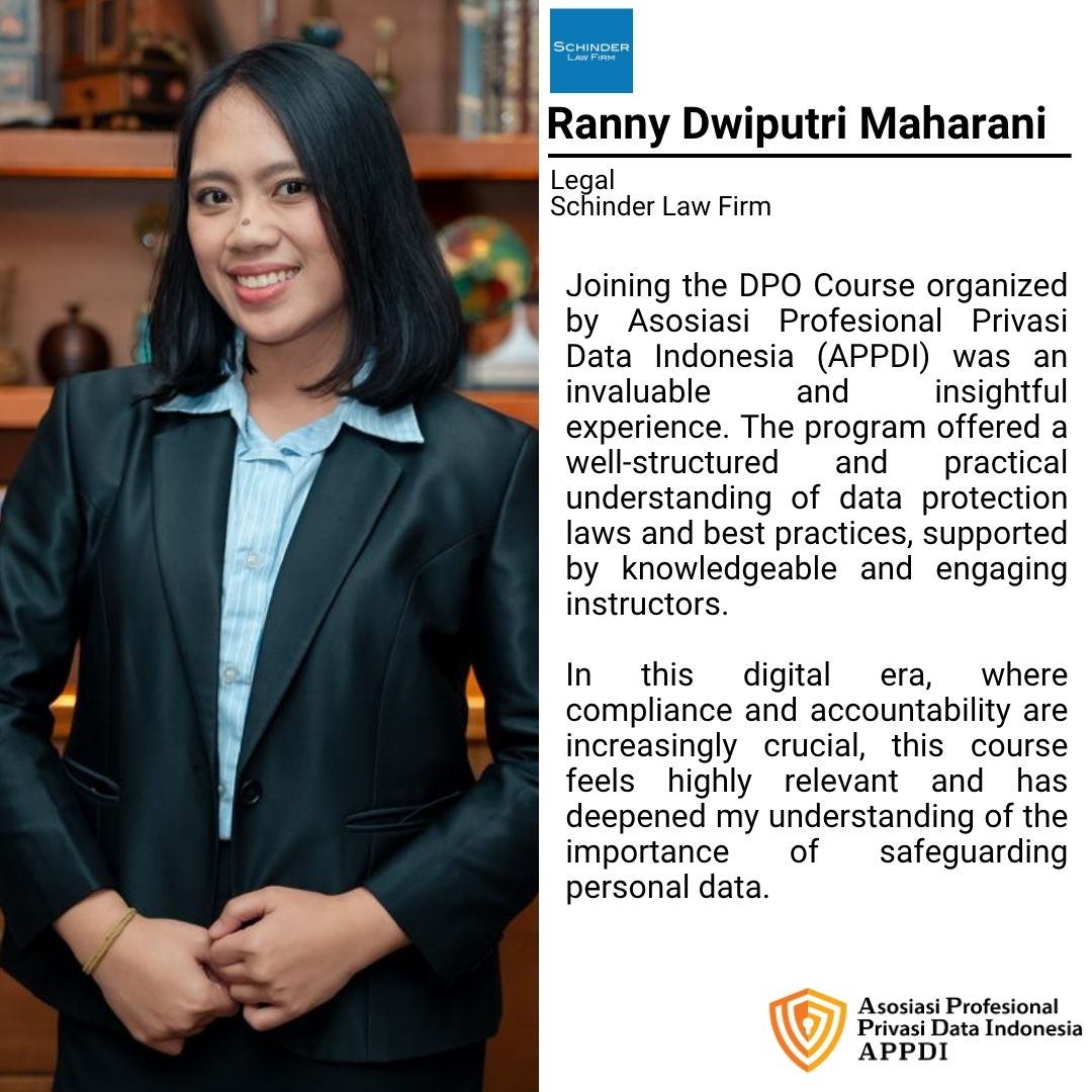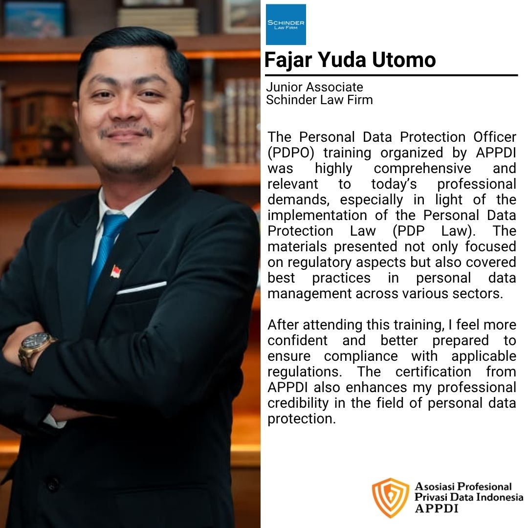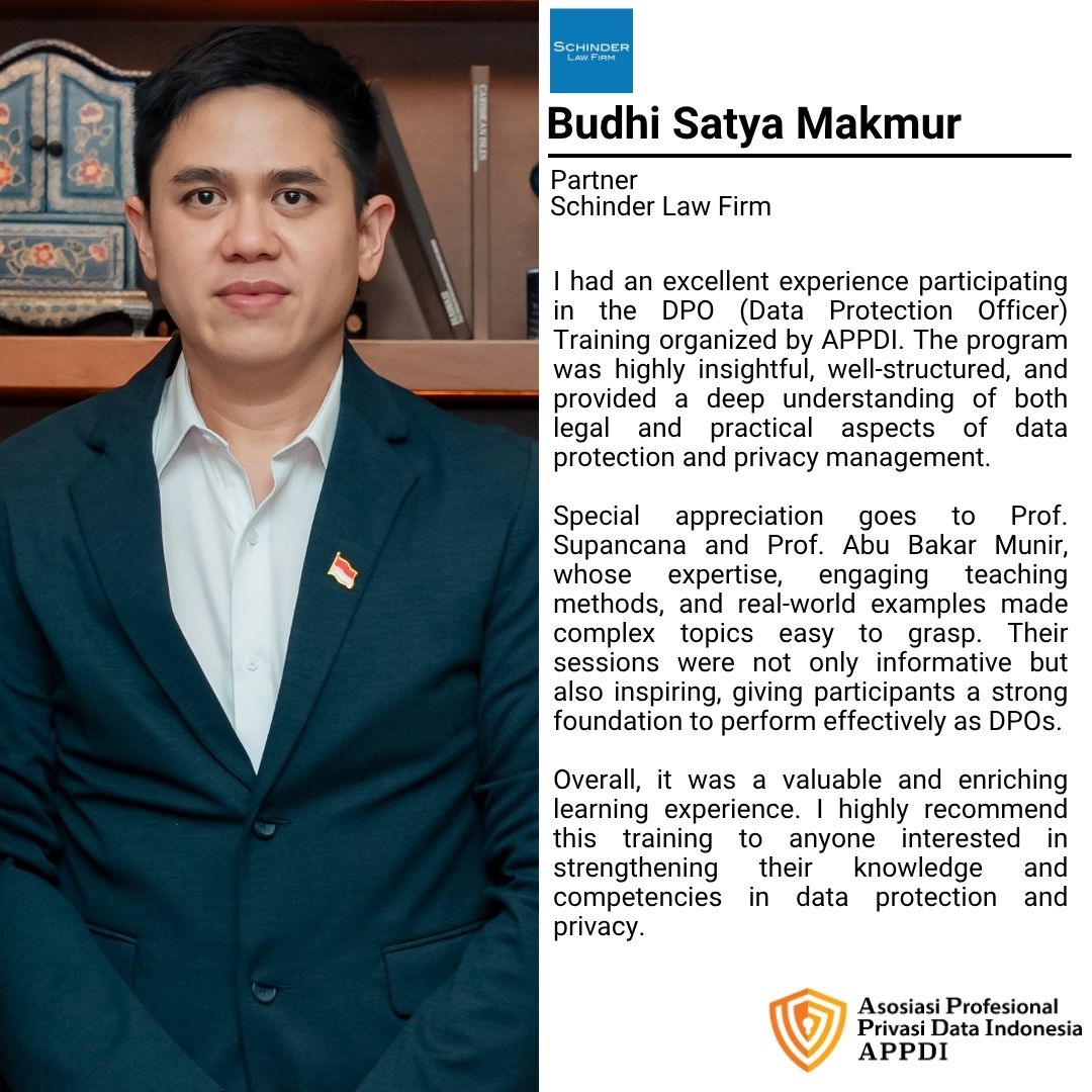 Asosiasi Profesional Privasi Data Indonesia (APPDI), supported by Schinder Law Firm, presents DPO Online Course #24 一 Pelatihan Pejabat Pelindungan Data Pribadi Bersertifikat.
