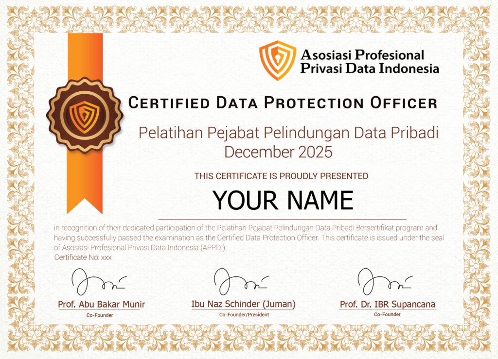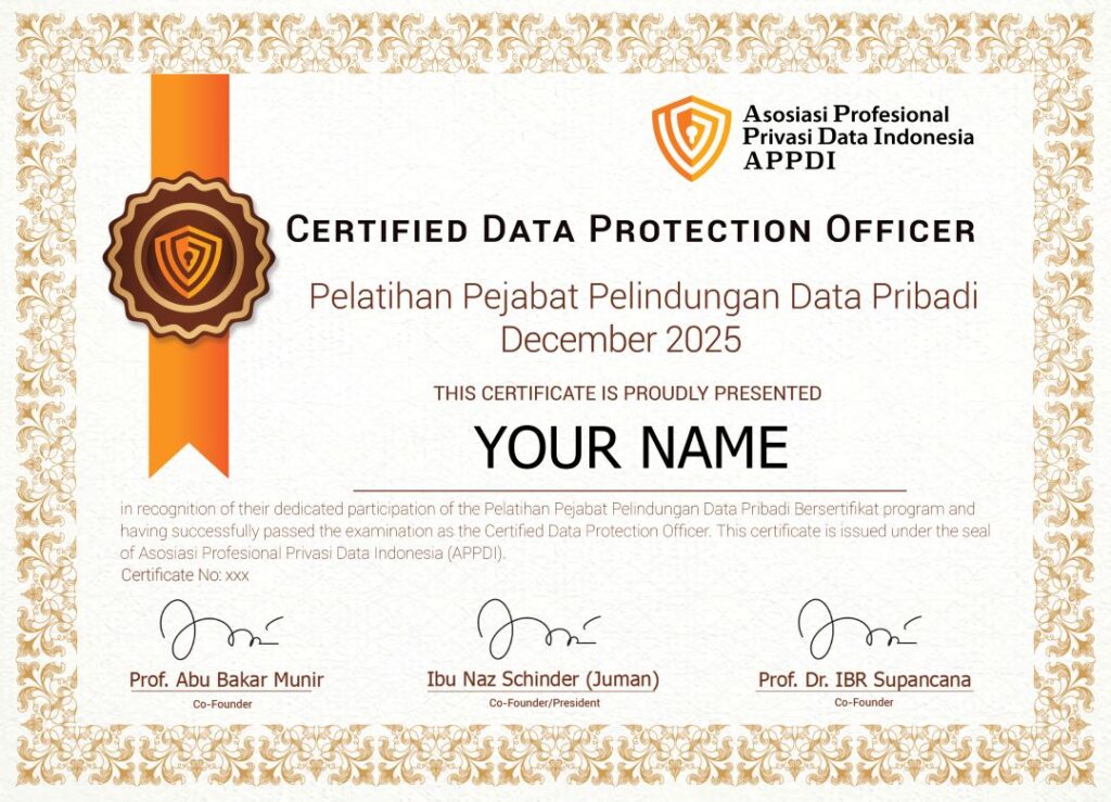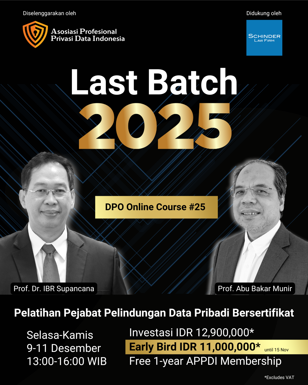 Asosiasi Profesional Privasi Data Indonesia (APPDI), supported by Schinder Law Firm, presents DPO Online Course #25 一 Pelatihan Pejabat Pelindungan Data Pribadi Bersertifikat.